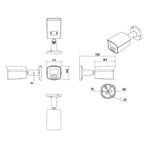 1/2.7" SC8238, SSC338Q, MJPEG/H.264/H.264+/H.265/H.265+, макс. разрешение 3840*2160@20fps. Объектив 2,8мм. ИК подсветка дальностью 30м. Встроенный микрофон. ONVIF 2.4, WDR 120дБ, 3D NR, BLC, ROI, Defog («антитуман»), 3 приватные зоны, коридорный режим, детектор движения. Внешний слот для SD карты до 512Гб. Питание: PoE (IEEE 802.3af) / DC12В 700мА. IP67, рабочая температура: -40...+60°C, размеры 72x66x175мм, вес 850 г. Приложение BitVision.