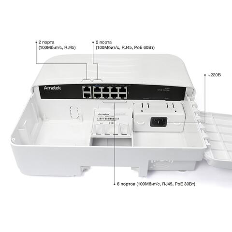 2 порта 10/100Mbps RJ45, HiPoE до 60Вт каждый;
