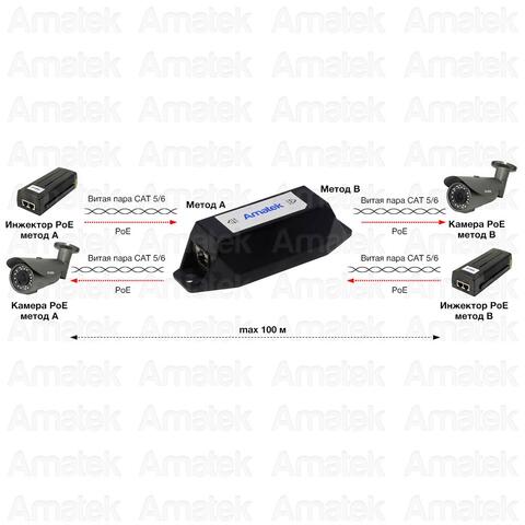 Конвертер методов PoE (А/В). Поддерживаемые методы: A (1,2(+), 3,6(-)), B (4,5(+), 7,8(-)). Мощность PoE - до 30Вт. Поддержка PoE (IEEE 802.3af/at).  Совместим с устройствами Passive PoE. Автоматическое определение активных PoE устройств. Порты: вход RJ45(10/100 Base-T), выход RJ45(10/100 Base-T). Не требует внешнего питания. Размеры 130x47x33 мм. Рабочая температура -0...+45 гр.