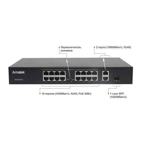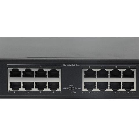 16 портов 10/100Mbps  RJ45,  Auto-MDIX, PoE/PoE+ до 15.4/30 Вт каждый;