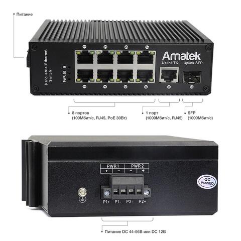 Промышленный коммутатор на 10 портов (8 PoE+ портов + 1 порт Uplink + 1 слот SFP):